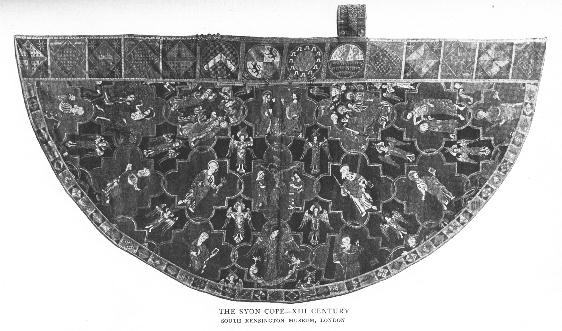 The earliest mention of a cappa seems to meet us in Gregory of Tours, and in the "Miracula" of St. Furseus where it seems to mean a cloak with a hood. So from a letter written in 787 by Theodemar, Abbot of Monte Cassino, in answer to a question of Charlemagne about the dress of the monk (see Mon. Germ. Hist.: Epist. Carol., II, 512) we learn that what in Gaul was styled cuculla (cowl) was known to the Cassinese monks as cappa. Moreover the word occurs more than once in Alcuin's correspondence, apparently as denoting a garment for everyday wear. When Alcuin twice observes about a casula which was sent him, that he meant to wear it always at Mass, we may probably infer that such garments at this date were not distinctively liturgical owing to anything in their material or construction, but that they were set aside for the use of the altar at the choice of the owner, who might equally well have used them as part of his ordinary attire. In the case of the chasuble the process of liturgical specialization, if we may so call it, was completed at a comparatively early date, and before the end of the ninth century the maker of a casula probably knew quite well in most cases whether he intended his handiwork for a Mass vestment or for an everyday outer garment. But in the case of a cappa, or cope, this period of specialization seems to have been delayed until much later. The two hundred capp or cope, which we read in a Saint-Riquier inventory in the year 801, a number increased to 377 by the year 831, were, we believe, mere cloaks, for the most part of rude material and destined for common wear. It may be that their use in choir was believed to add to the decorum and solemnity of the Divine Office, especially in the winter season. In 831 one of the Saint-Riquier copes is specially mentioned as being of chestnut colour and embroidered with gold. This, no doubt, implies use by a dignitary, but it does not prove that it was as yet regarded as a sacred vestment. In fact, if we follow the conclusions of Mr. Edmund Bishop (Dublin Review, Jan., 1897), who was the first to sift the evidence thoroughly, it was not until the twelfth century that the cope, made of rich material, was in general use in the ceremonies of the Church, at which time it had come to be regarded as the special vestment of cantors. Still, an ornamental cope was even then considered a vestment that might be used by any member of the clergy from the highest to the lowest, in fact even by one who was only about to be tonsured. Amongst monks it was the practice to vest the whole community, except, of course, the celebrant and the sacred ministers, in copes at high Mass on the greatest festivals, whereas on feasts of somewhat lower grade, the community were usually vested in albs. In this movement the Netherlands, France, and Germany had taken the lead, as we learn from extant inventories. For example, already in 870, in the Abbey of Saint Trond we find "thirty-three precious copes of silk" as against only twelve chasubles, and it was clearly the Cluny practice in the latter part of the tenth century to vest all the monks in copes during high Mass on the great feasts, though in England the regulations of St. Dunstan and St. Æthelwold show no signs of any such observance. The custom spread to the secular canons of such cathedrals as Rouen, and cantors nearly everywhere used copes of silk as their own peculiar adornment in the exercise of their functions.